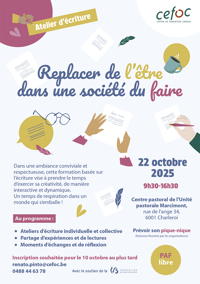 12 octobre en l’église Saint-Paul de Mont-sur-Marchienne Résistance Projection du film et rencontre de Raymond Remy, un des derniers résistants en vie de la région Cliquez pour les renseignements | Centre Pastoral de l’Unité Pastorale Atelier d’écriture : Replacer l’être dans une société du faire 22 octobre 9h30-16h30 Cliquez pour les renseignements |