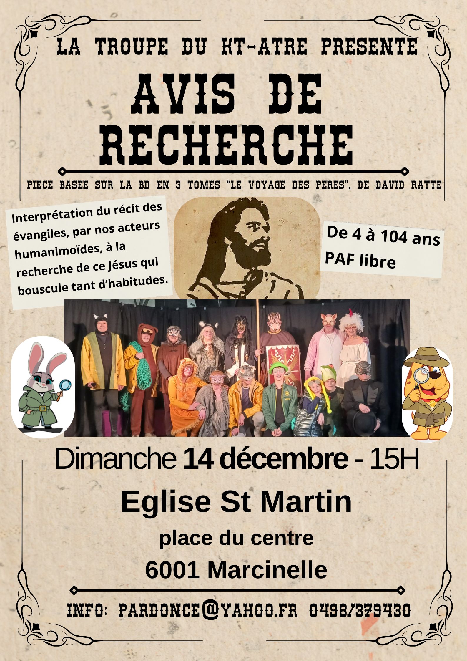 Jusqu’au 16 novembre Exposition Homo Detritus au Bois du Cazier Cliquez pour les renseignements | KT-ÂTRE présente Avis de Recherche le 14 décembre à 15 H à l’église Saint Martin / Marcinelle Centre Cliquez pour les renseignements |