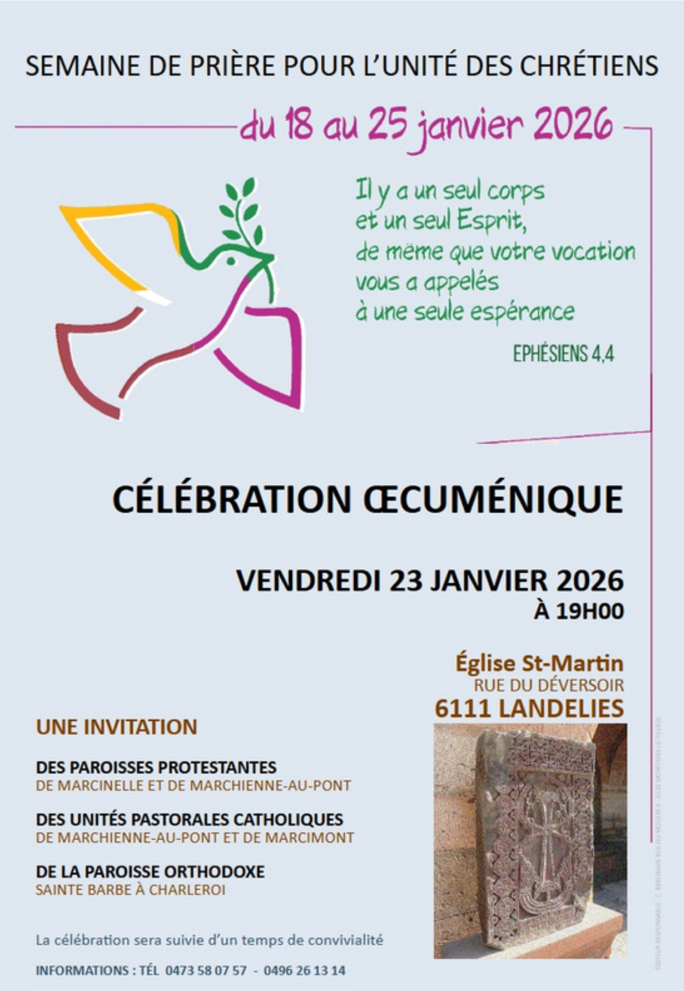 | Partage d’Évangile : La Parole autour de la table Mardi 6 Janvier de 19h à 20h30 au 27 rue Érasme Marcinelle – Jeudi 8 janvier de 13h30 à 15h au Centre Pastoral – rue de l’ange 34 Marcinelle Cliquez pour en savoir davantage | « Il y a un seul corps et un seul Esprit, de même que votre vocation vous a appelés à une seule espérance » (Éphésiens 4, 4) SEMAINE DE PRIÈRE POUR L’UNITÉ DES CHRÉTIENS du 18 au 25 janvier Célébration oecuménique à Landelies le 23 janvier à 19h30 Cliquez pour les renseignements Les activités prévues à Charleroi : cliquez ici |
