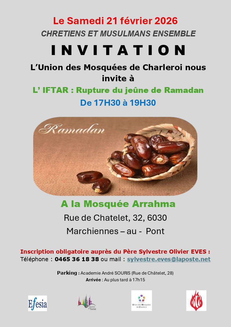 Chrétiens et musulmans ensemble… le 21 février à 17h30, l’Union des Mosquées de Charleroi nous invite à l’IFTAR, la rupture du jeune de Ramadan : à la Mosquée de Marchienne-au-Pont. Inscription obligatoire auprès du père Sylvestre.Cliquez pour les renseignements.